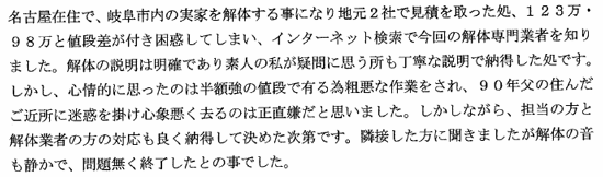 名古屋在住で岐阜市内の実家を解体する事になり地元2社で見積もりを 取った処、123万、98万と値段差が付き困惑してしまい、 インターネット検索で今回の解体専門業者を知りました。